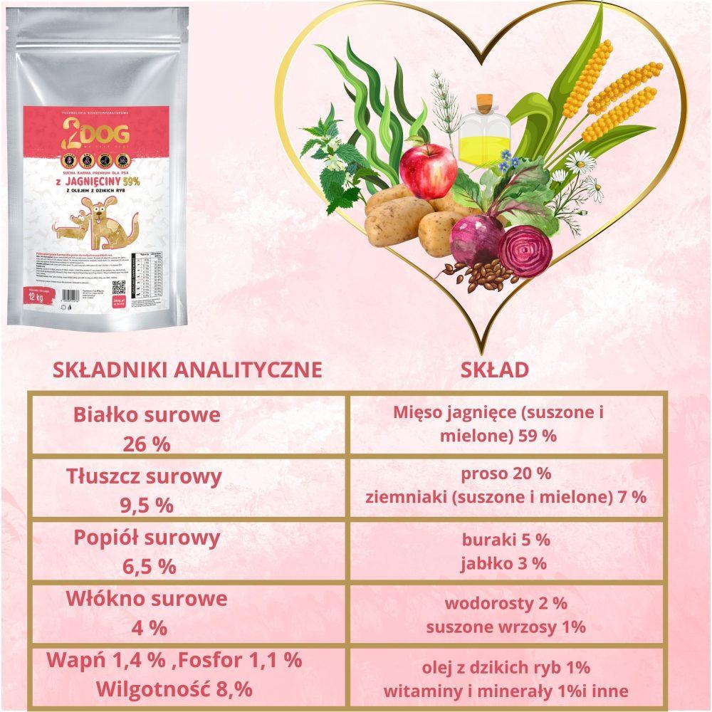 ❤️2DOG Premium – Sucha Karma dla Psów z Jagnięciny, Olejem z Dzikich Ryb, Prosa, Buraka i Jabłka 12KG